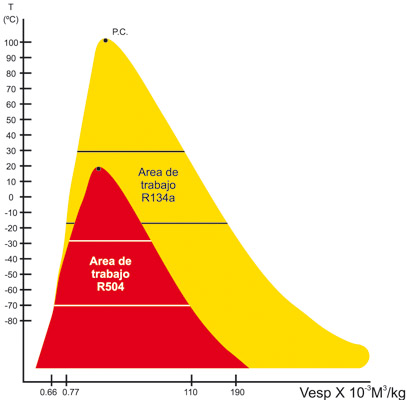 • En este último punto se puede apreciar mejor la figura 1, en donde se muestran dos refrigerantes típicos, cuyas áreas de trabajo corresponden al aire acondicionado (R-134a) y refrigeración doméstica, y el otro (R-504) a la refrigeración industrial como se puede ver a continuación.